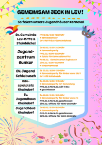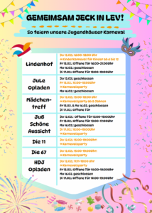 Auch in diesem Jahr wird in den Leverkusener Jugendhäusern wieder kräftig Karneval gefeiert! Freut euch auf bunte Karnevalspartys, Kinderkarneval, Musik, Spiele und jede Menge gute Laune. Ob verkleidet oder nicht – alle sind herzlich willkommen, gemeinsam jeck zu sein!
